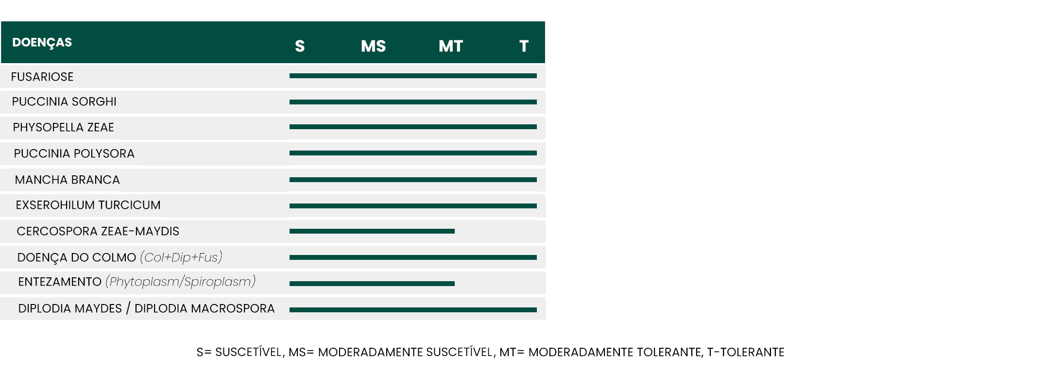 Alto nivel de tolerância ao acamamento. Precocidade com alta sanidade foliar e potencial produtivo para grãos, silagem e milho verde opcional.